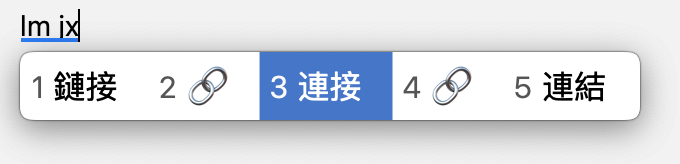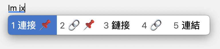 但置顶候选仅在完整匹配当前输入时才会生效。在下面的例子中,输入 lmj, lm, l, 甚至 lmjxf 都不会置顶「连接」。